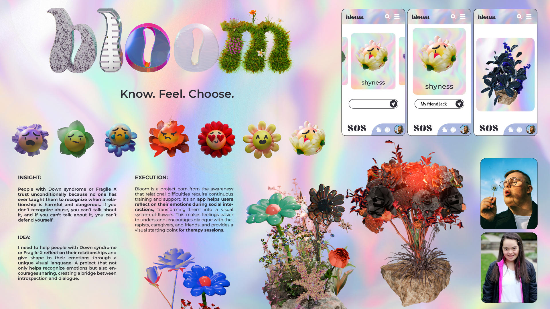 “Bloom” 以包容且视觉导向的方式探讨“情绪教育”这一主题。这款应用专为患有唐氏综合征或脆性 X 综合征的人群设计,通过将情绪与社交体验转化为数字化花卉图案的形式,为识别与表达情感提供了更直观、更易理解的途径。这一视觉系统成为了促进使用者与照护者、治疗师展开对话的有力工具,提升情绪意识,助力个人成长。该项目展现了设计如何以有意义的方式促进福祉与人际联结。